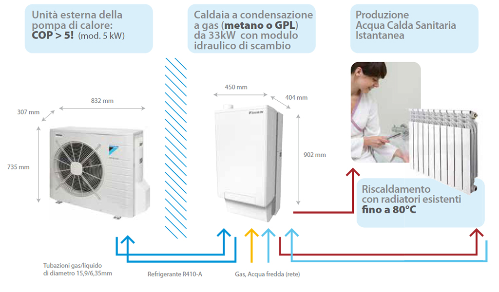 Il sistema ibrido caldaia a condensazione e pompa di calore è l'ideale per sostituire le vecchie caldaie murali mantenendo gli esistenti radiatori ad alta temperatura, con un ottimo rendimento in riscaldamento: il 35% più efficiente di una caldaia a condensazione. Inoltre, la produzione di Acqua Calda Sanitaria mediante pompa di calore riesce a massimizzare l’uso di energia rinnovabile o in istantanea, con la massima efficienza!