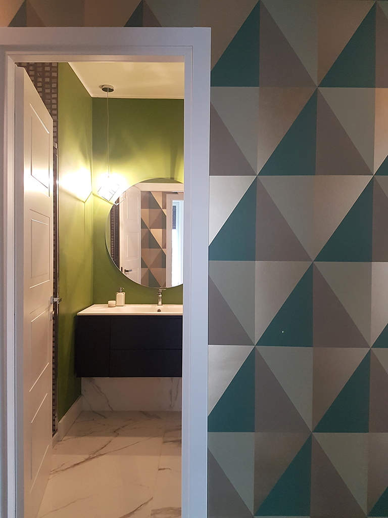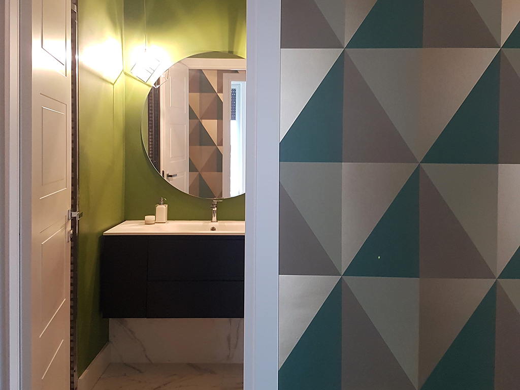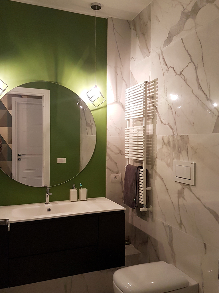 Anche nel bagno piccolo senza finestra abbiamo usato lo stesso gres effetto Calacatta per pavimento e pareti, alternandolo però ad un brillante verde pistacchio. Questo secondo bagno, un ambiente più piccolo e meno maestoso, mi ha suggerito una posa delle lastre in orizzontale che pare quasi allungare le pareti.
