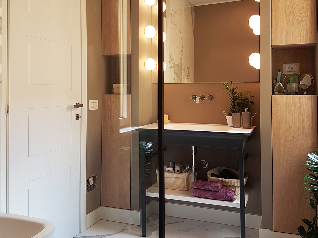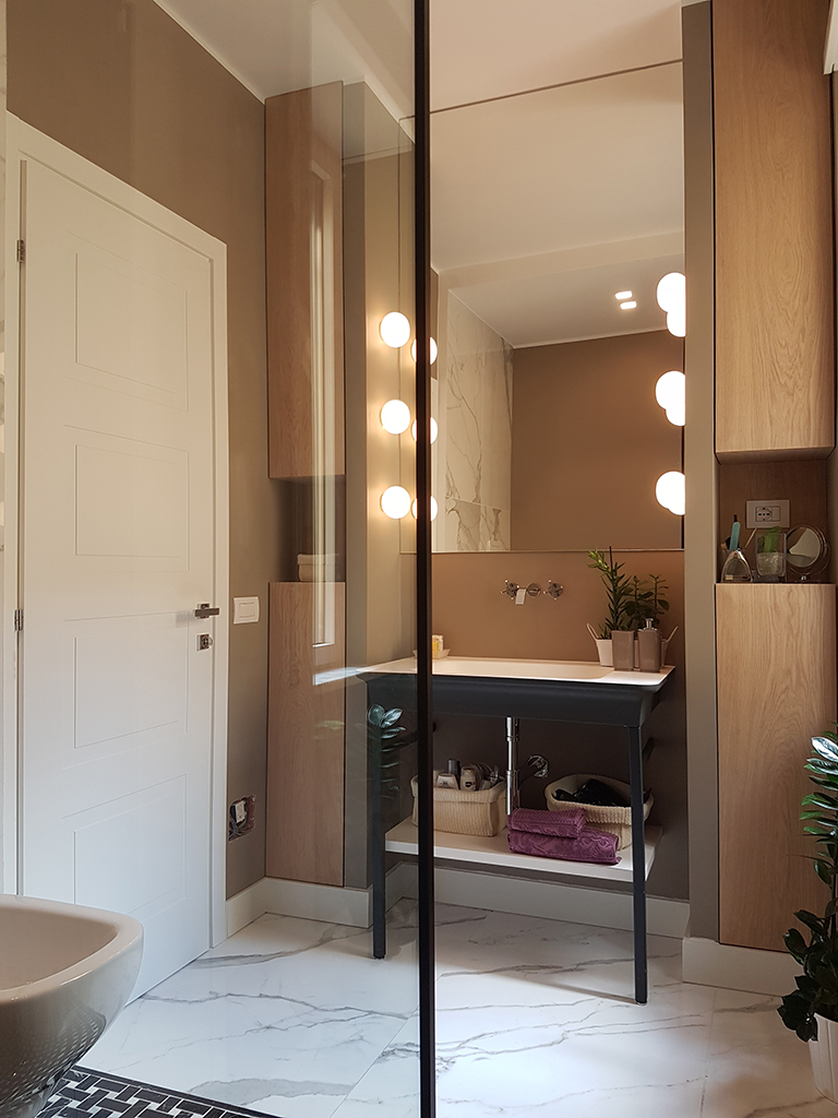 Ma affrontiamo intanto il tema servizi con il focus sui rivestimenti e su come li ho usati. A monte c’era un’idea a me cara: realizzare un intervento filologico, quindi un impianto contemporaneo con un “sospetto” vintage, un déjà vu. Fortunatamente ho trovato una committenza allineata, che ha sposato la mia proposta fissando subito l’utilizzo di un gres effetto marmo chiaro, Calacatta nel nostro caso per la sua base meno grigia rispetto al Carrara, in un formato importante 75x150.