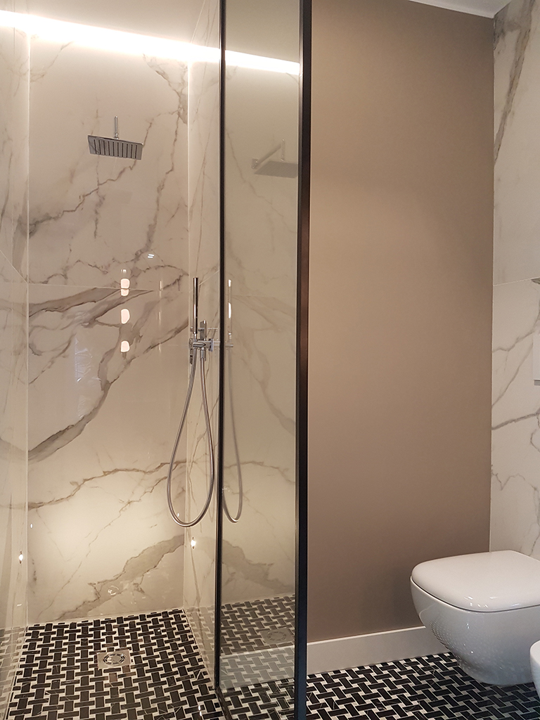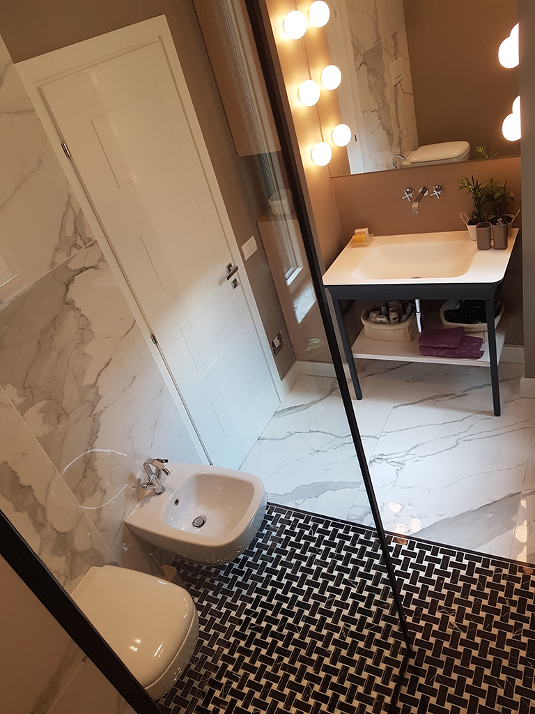 Per il bagno grande abbiamo deciso di utilizzare il Calacatta nella parte bassa del pavimento e un mosaico con alternati quadrati e rettangoli nero Marquina e Calacatta (sempre in gres) per la zona sopraelevata di doccia e servizi.