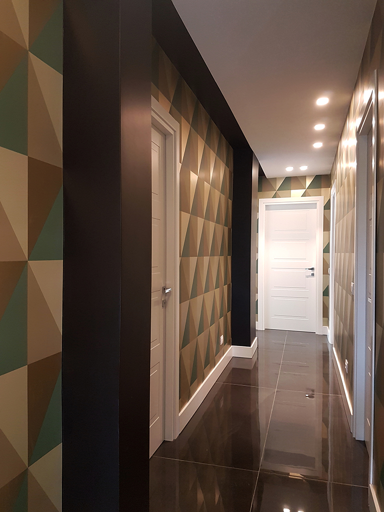 Questo vago sapore retrò ha nel corridoio la sua cerniera: non potendolo ridurre abbiamo deciso, di dargli un carattere. Quindi carta da parati (nel pieno della tradizione anni 50 e 60) e un gioco tra pilastri e controsoffitto che maschera i primi e da dignità al secondo ... come si dice, se il nemico non si può sconfiggere, meglio farselo alleato.