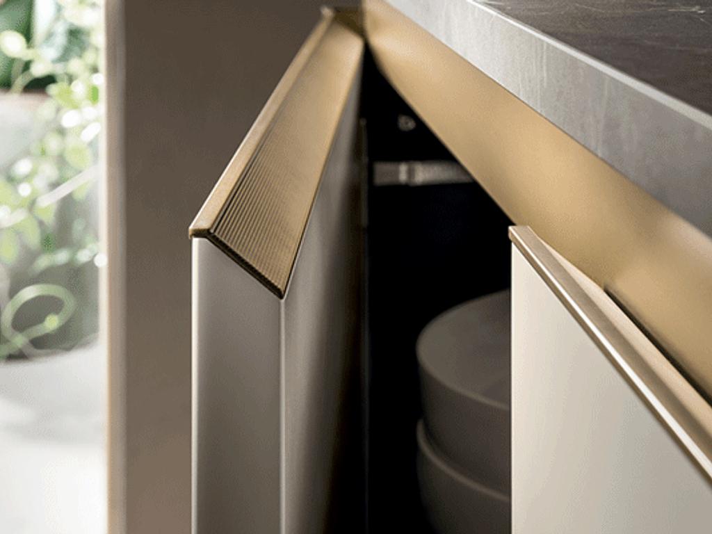 La cucina Delinea  ha nel proprio tratto stilistico l'assenza della maniglia ma con un profilo in alluminio incassato a 45° per facilitare la presa. L'anta senza maniglia con un profilo in tinta con la gola  è un particolare di indubbia bellezza stilistica che rende la composizione DeLinea sofisticata ma dall'animo contemporaneo.